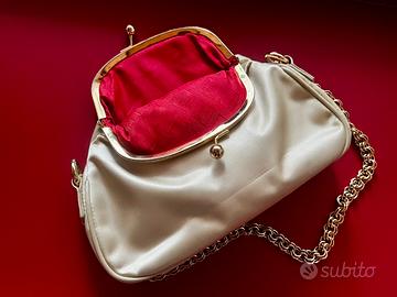 Borsetta Redwall vintage in raso color giallo champagne con tracolla color oro