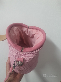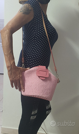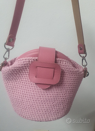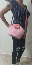 Dolce borsetta rosa fatta a mano, all'uncinetto, in cordino italiano e in vera pelle di alta qualità. Le dimensioni sono altezza 20 cm, larghezza 23 cm. La fodera è in cotone rosa. La chiusura a scatto è rivestita in pelle, la patellina ha un bottone a calamita.