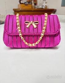 Il corpo è intrecciato su base in rete canvas con cordino lucido fucsia, rifinito da una catena dorata con perle e un fiocco oro sul davanti che aggiunge un tocco elegante e femminile