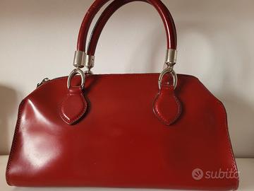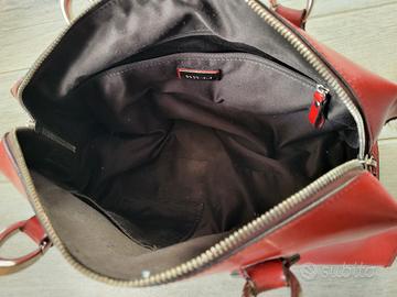 in pelle , senza tracolla . chiusura con zip e taschina interna con cerniera - interni ottimi - presenta qualche segno di usura sui manici