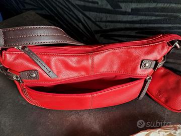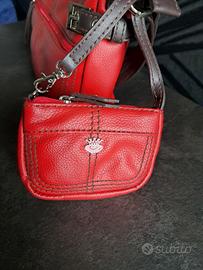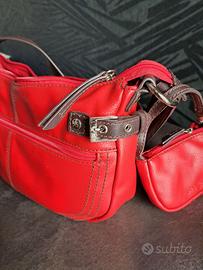 Borsetta rossa marca Segue con manici marroni e con un piccolo borsellino, mai utilizzata. Sulla parte frontale presenta una tasca con chiusura con zip, così come all'interno. Dimensioni; circa cm 30 x 16