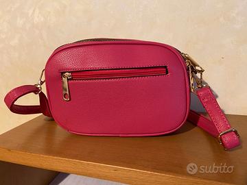 Borsetta rossa con tracolla. Tre cerniere centrali e una posteriore, una tasca interna e una con cerniera.