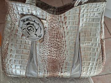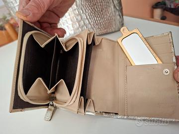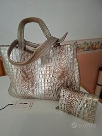 Borsetta vintage Silvano Biagini in pelle con lavorazione coccodrillo colore oro/argento. Vedi scontrino. La borsa costa euro 48. Portafoglio abbinato pari al nuovo costa euro 18. Come si vede da foto è un set bellissimo e tenuto in perfette condizioni.