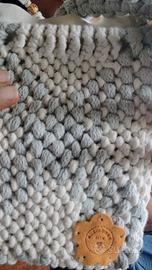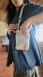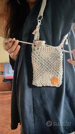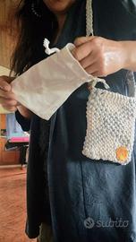 Borsetta a tracolla per bimba fatta in macramè. È presente un sacchetto di lino, estraibile e completamente lavabile.