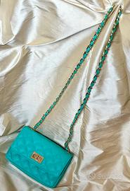 Borsetta trapuntata con tracolla in metallo e pelle, col celeste pallido