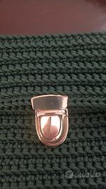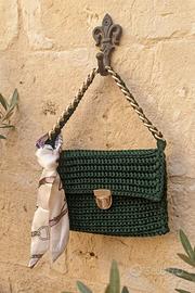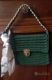 Borsetta realizzata a mano all'uncinetto - impreziosita da un foulard da borsetta in seta e raso - chiusura a tuc - interno in feltro - misure 21,5 x 16 cm - colore verde scuro - manico a catena rivestita