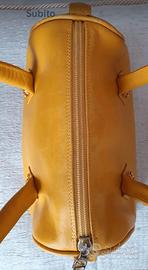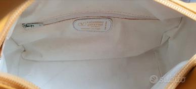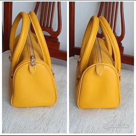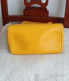 Deliziosa borsetta Valentino Garavani, degli anni '80, in pelle, gialla, con inserti dorati, e logo V marchiato davanti, interno in pelle bianca integro, con taschina con cerniera, manici e cerniera in perfette condizioni. Esternamente, in ottime condizioni, da segnalare qualche segno d'uso, soprattutto sui bordi. Pezzo raro e prezioso. Misure: altezza cm 15, larghezza cm 20, profondità cm 12.