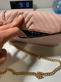 Borsetta rosa con scomparti interni e cerniera e scomparto sul retro con tracolla