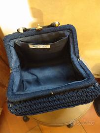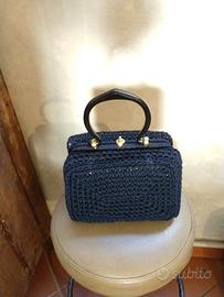 BORSETTA VINTAGE anni'60 LAVORATA MACRAME' CON MANICO forse in bachelite, comunque un bellissimo materiale e dettagli in metallo forse ottone. colore blu scuro