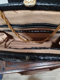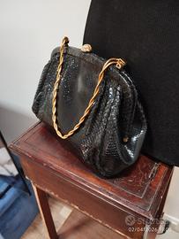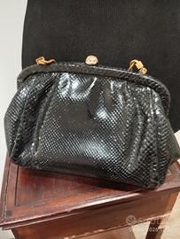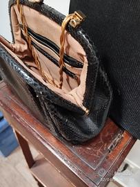 bellissima borsetta vintage in pelle nera di pitone con portata a mano chiusura e inserti in metallo dorato (15x23x5 cm)