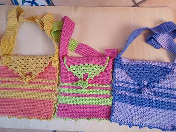 queste borsine in cotone sono realizzate interamente ad uncinetto...disponibili in molte varianti di colore, misurano 20x20 cm più tracolla. per trasloco vendesi al prezzo simbolico di 3 euro ciascuna. oltre ad i colori in foto ce ne sono disponibili molte altre