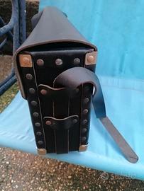 Borsone da lavoro artigianale interamente in cuoio spesso, con tracolla senza cuciture, solo con chiodature. Nuovo mai usato. Isolamento 1000 Volt. Dimensioni: cm 43x30x13.