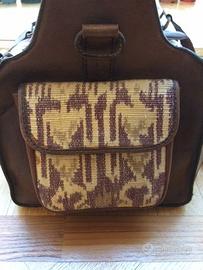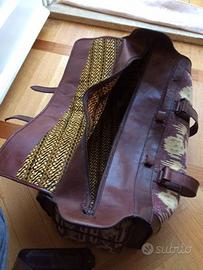 Borsone indonesiano in pelle e tessuto batik molto resistente. Con tasca laterale e tracolla. Fatto a mano. I colori sono prugna scuro e crema. Si consegna a Milano o Modena oppure si spedisce con costi di invio a carico dell'acquirente.