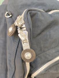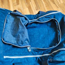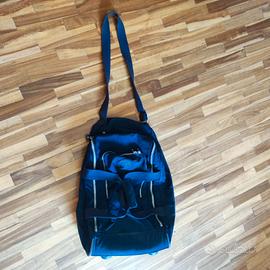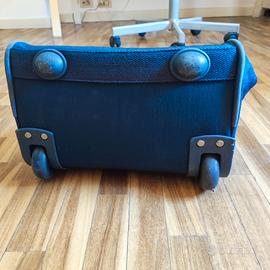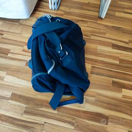 Borsone da viaggio con due ruote e spallacci (manici). non essendo rigida, si ripone facilmente. ha una tasca esterna e due spazi per effetti personali interni. gli spallacci e un manico lungo per l'impugnatura dall'alto e le due ruote consentono di trasportarla in più modi. Usata due volte, non ha segni di usura. Dimensioni: A52, P32, L31 cm. Dimensioni da bagaglio a mano.