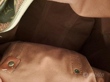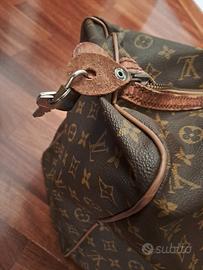Borsa da viaggio sac souple in tela a due manici Louis Vuitton originale. Buono stato, piccole riparazioni nel tempo. Chiusura a zip più lucchettino con 2 chiavi. Colore Marrone della tela e inserti in vera pelle più chiara. Anni 70. Misure 44.5x32x18 cm