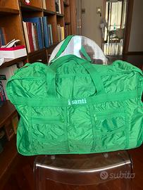 Borsone da viaggio ripiegabile I Santi Milano - molto robusto e capiente - foderato color argento - con tracolla - due taschine frontali con cerniera - molto ben rifinito con doppie cuciture - si richiude in una pratica bustina - L 60 x H 40 x P 30 - come nuovo, usato solo una volta