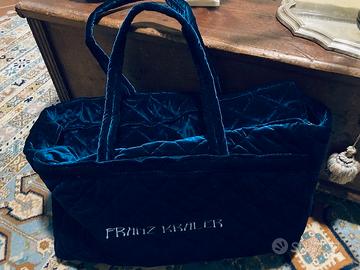 Borsone velluto , morbidissimo , un blu che cambia di tonalità a secondo della luce , nuovo mai usato . Franz Kraler ha il famoso negozio a Cortina , boutique del lusso Multimarca dal 1984 . Misure 55 cm base H 32 cm prof. 18 , manici fissi lunghi 79 cm....essendo stoffa morbida è molto capiente , una sola tasca a scomparsa sul davanti (vedere foto). Non ho la busta