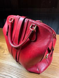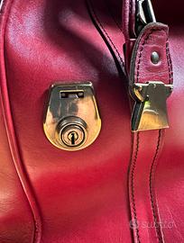 Bellissimo borsone "swinging London" anni 60 marca Cheney in vera pelle colore rosso, LxHxP 45x40x21. Manici con fibbie ottonate, fibbia centrale ottonata, sistema di chiusura con serratura e chiave da oliare, grande chiusura lampo di chiusura, interno in tessuto cotone beige con tasche varie e chiusura lampo per tasca privacy. La borsa è in buono stato, non molto utilizzata, con qualche segno del tempo che ne aumenta l'aspetto vintage, bellissima.