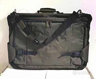 Borsone Fila con apertura interna e crucce per trasporto giacche o abito. Apertura posteriore di grande dimensioni. Due tasche interne. Due tasche frontali contenenti una custodia porta laptop e busta di nylon portascarpe. Maniglia e cinghia tracolla. Colore verde. Nuovo, mai utilizzato.