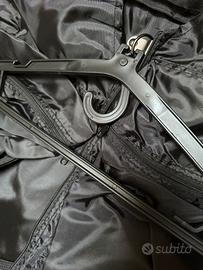 Colore verde scuro. con tracolla, vari scomparti interni ed esterni; ideale per il trasporto di abiti completi uomo/donna; in dotazione ci sono n. 2 grucce e n. 1 borsa porta computer portatile.
