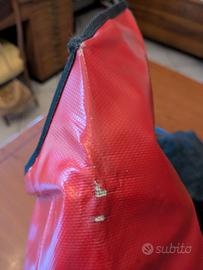 Borsone rosso in PVC originale Stone Island provvisto di tracolla con logo. Tre tasche interne con alloggiamento per tre biro. Piccoli segni di usura come da foto