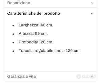 Comunque capientissima ed impermeabile resistente e molto stilosa...con tracolla regolabile molto lunga e tasca interna impermeabile per i piccoli oggetti.