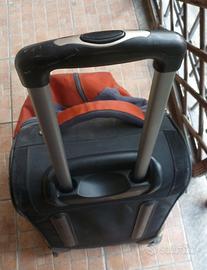 Borsone di tela molto robusta, ha il vantaggio di avere le ruote e diventare così un trolley più facilmente trasportabile