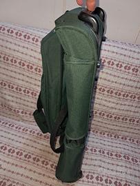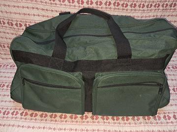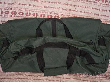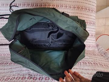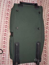 Borsone con 2 ruote,2 tasconi davanti, 2manici + 1 telescopico . Chiuso con zip, si appiattisce in pochissimo spazio, pesa solo 1,7 kg Misure 60x 33