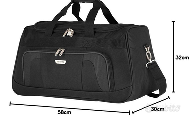 - Borsa da viaggio, o valigia o borsone per palestra con tracolla; dimensioni: 30 x 58 x 32 cm; volume 50 L; peso 0.9 kg; materiale poliestere; colore nero.