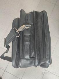 Borsone in pelle Nero I SANTI La borsa si presenta in condizioni IMPECCABILI come Nuova. La pelle e' morbida e non ha nessun segno o graffio. Il colore è nero (nelle foto sembra grigio). La borsa ha la tracolla e due maniglie. Ci sono due cerniere che permettono di accedere ai due spazi principali uno con 3 scomparti uno con uno scomparto. Nella parte frontale ci sono 2 tasche con doppia cerniera. Nella parte posteriore una piccola tasca con cerniera più un bottone + una cerniera che aprono una tasca che permette di infilare la borsa sui manici di un trolley. Misure :lungh 45cm x h 28xlarg 13 (con i tasconi vuoti, 18 pieni )