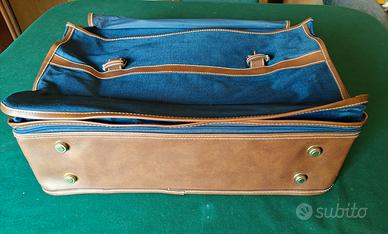 Borsone/valigia come nuovo, senza alcuna imperfezione, semirigido (circa cm 50 x 40 x 20) marca “Martini Racing Club Collection”, in tela denim blu, con finiture in pelle marrone, dal design classico, robusto e funzionale, ideale per brevi viaggi, weekend o come borsa sportiva.