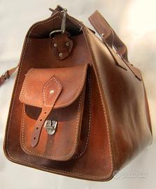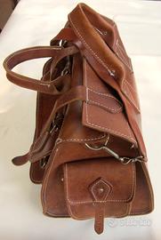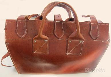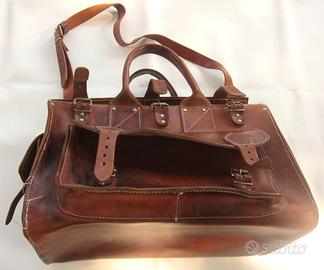 Borsone in vero cuoio, di artigianato greco, cucito a mano, robustissimo, con 2 maniglie, 3 tasche esterne chiudibili e cinghia tracolla staccabile, lungo cm 46 (tasche incluse), alto cm 39 (maniglie incluse), largo alla base cm 28 (inclusa tasca sul lato lungo), spessore cuoio mm 3, peso kg 2,150.