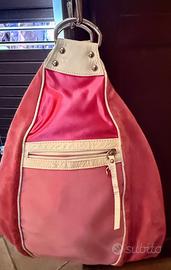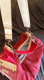 Borsone di grandi dimensioni,che si trasforma in borsa giornaliera E’ in camoscio morbidissimo rosa/ rosa cipria. Ha dei tasconi trasparenti sul davanti e nel retro. Sul fondo ci sono dei piedini .Ha due tracolle una grande bianca e l altra in pelle piu piccola per usarlo come borsa nel quotidiano. Ha una piccola macchiolina su un lato che non si nota su lato verso il fondo( ho messo la foto dove , oltretutto si nota di più )e la tracolla bianca si è sporcata in alcuni punti ma che si può lavare. Mai usata