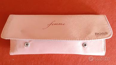 Elegante set pennelli trucco da viaggio, confezionati in un astuccio in raso colore rosa. La chiusura è con bottoni automatici. I pennelli sono 4, tutti ancora protetti dalla propria bustina trasparente e sigillata. Nel lato destro dell'astuccio c'è una tasca con chiusura lampo utile per poter mettere prodotti per il make up.