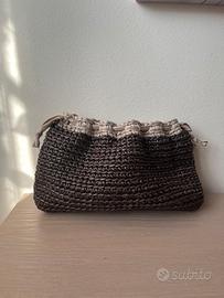 Borsa a saccottino artigianale fatta a mano all’uncinetto, realizzata da me in filato di ecopelle color marrone e dettaglio beige.