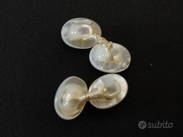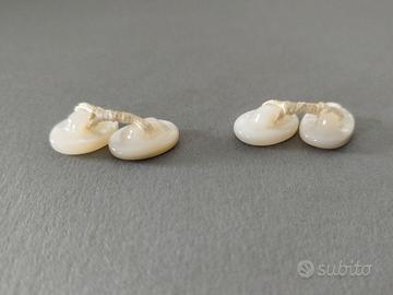 Coppia di bottoni gemelli da camicia In madreperla Legati da un elemento in cordino Forma ellittica Dimensione: 1,5 x 1 cm