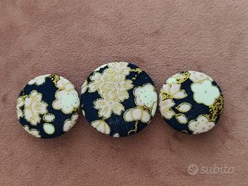 Bottoni fatti a mano con tessuto giapponese, decorati con fiori di ciliegio e dettagli dorati.