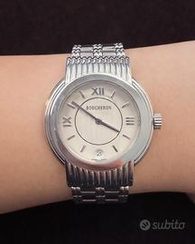 Titolo: Boucheron reflet solis steel - Quartz 35 mm ; Peso: 92.17; Misura: 15/19 cm ; Anno: 2000 (circa); Corredo: Pochette e Garanzia del rivenditore; Carica: Quarzo; Calibro: 955.412; Rubini: 7; Colore quadrante: Beige; Corona: Acciaio; Diametro cassa: 35mm; Ghiera: Acciaio Materiale cassa: Acciaio; Materiale cinturino: Acciaio; Vetro: Zaffiro Cod: 8466-a