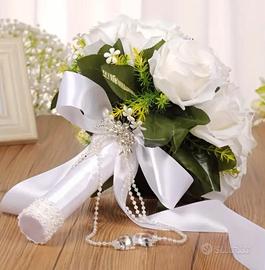 Bouquet di Rose Artificiali con Rose Champagne Bianche e Nastro in Pizzo - Bouquet da Sposa per Damigelle, Decorazioni Autunnali, Centrotavola, Fiori Romantici, Dettagli Delicati, Regalo d'Amore per San Valentino