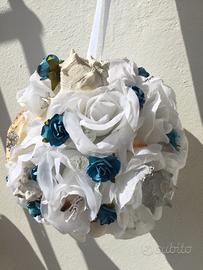 Palla di circa 16 cm con rose bianche, conchiglie vere, stella marina e perle, con gioielli argentati a tema mare e spiaggia. Per un matrimonio o una festa in estate.
