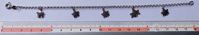 Vendesi bracciale con ciondoli a forma di stella, caratterizzato da finiture bicolore (argento e oro). Il gioiello è in ottime condizioni estetiche, come visibile dalle foto. Caratteristiche: Lunghezza bracciale aperto: 20 cm circa Numero ciondoli: 5 stelline Chiusura: Moschettone Materiale: Metallo color argento/oro (senza punzonatura)