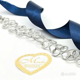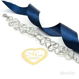 Il bracciale è composto da tanti anelli a forma di 8 che si agganciano uno nell'altro, su 2 file, sono argentati e creando un bellissimo effetto.