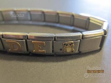 bracciale in acciaio e oro con lettere e orsetto panda. Componibili a piacimento.