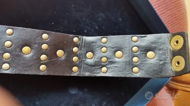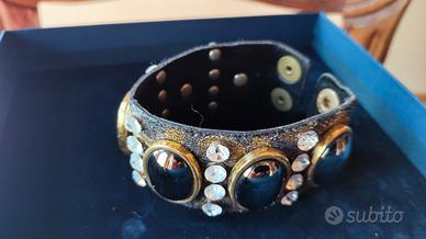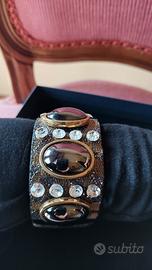 Bracciale di alta bigiotteria, a fascia alta pitonata, con applicazioni di pietre ovali color piombo lucente e profilo dorato, intervallate da file di strass.