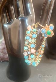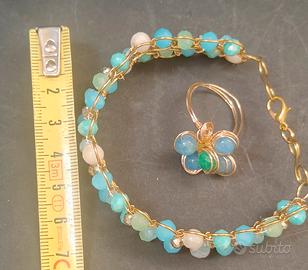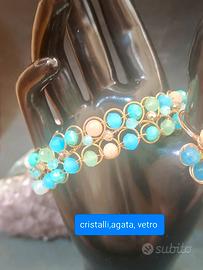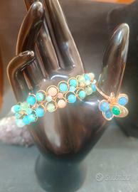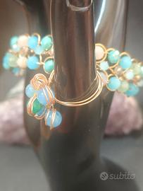 bracciale a fascia lavorato su ottone con pietre di agata, cristalli, vetro, anellino abbinato su base di ottone colori verde azzurro, turchese, bianco panna fatto da me a mano