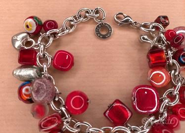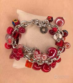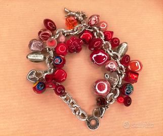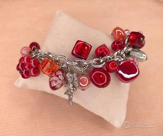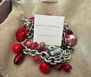 BRACCIALE ANTICA MURRINA CON PENDENTI Bigiotteria - Gioielli – Bracciali Splendido bracciale originale Antica Murrina Venezia, realizzato con autentiche perle in vetro di Murano Di colore rosso con sfumature arancio e argento, presenta numerosi charm pendenti in vetro artistico e tre in metallo argento a forma di cuore, ciuccio ed un angelo. Catena in metallo resistente con chiusura a moschettone, lunghezza regolabile lunghezza regolabile fino ad un massimo di 22 cm. Il monile è venduto corredato di certificato di autenticità e busta contenitiva in camoscio. Lo stato di conservazione è ottimo, pari al nuovo.