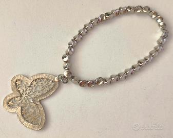 Elegante bracciale da donna con perline argentate e grande charm a farfalla.