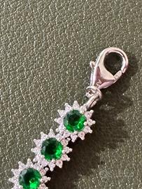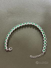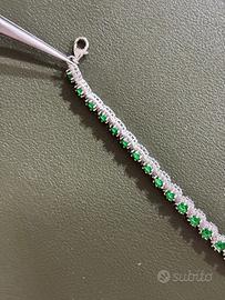 Raffinato bracciale tennis dal design classico e luminoso, impreziosito da splendide pietre verdi incastonate e contornate da piccoli punti luce che esaltano la brillantezza. Perfetto per occasioni speciali ma anche per dare un tocco chic a un outfit quotidiano. Chiusura regolabile per adattarsi comodamente al polso. 💚 Pietre verdi effetto smeraldo ✨ Dettagli luminosi eleganti 🔗 Chiusura regolabile 💎 Stile raffinato e senza tempo 🎁 Ideale anche come regalo