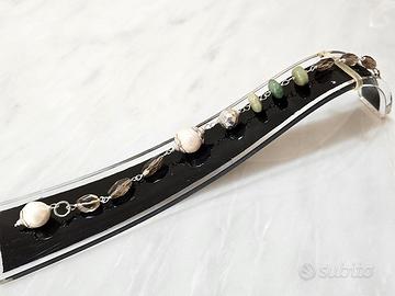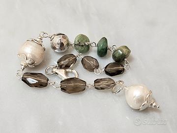 Delicato bracciale in argento 925 e pietre naturali: quarzo fumé, crisoprasio e perle Keshi. Realizzato a mano. Lunghezza: 19 cm c.a. Il bracciale è nuovo, mai indossato. La chiusura è a moschettone. Non si effettuano consegne a mano.