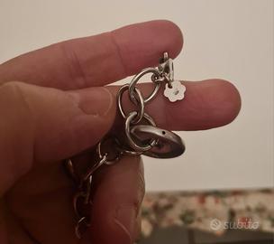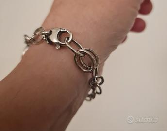 Bracciale argento a catena con motivo maglia marinara centrale. Chiusura con moschettone. Fatto artigianalmente pertanto eventuali asimmetrie o irregolarità non sono da considerarsi un difetto ma dimostrano che fatto artigianalmente. Indossato poche volte. Contenitore rosso solo per foto.